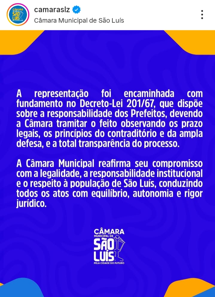 Em nota, a Câmara reafirmou o compromisso institucional com a legalidade e informou que todos os atos serão conduzidos com equilíbrio, autonomia e rigor jurídico.