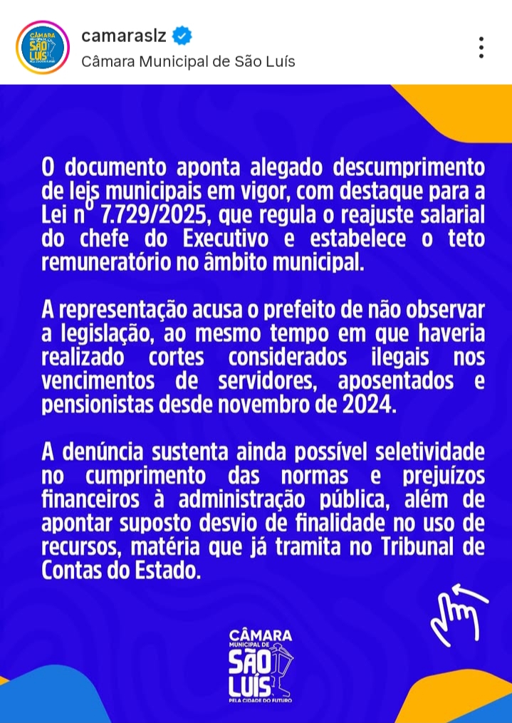 A denúncia sustenta que o prefeito teria descumprido legislações em vigor, com destaque para a Lei nº 7.729/2025, norma que define o reajuste salarial do chefe do Executivo e estabelece o teto remuneratório no âmbito municipal. Segundo a representação, enquanto a legislação não estaria sendo observada, servidores ativos, aposentados e pensionistas sofreriam cortes considerados ilegais em seus vencimentos desde novembro de 2024.