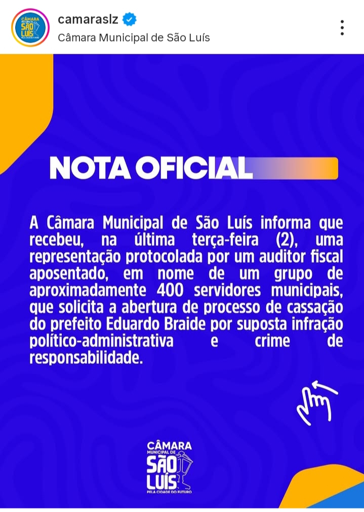 A Câmara Municipal de São Luís recebeu, na última terça-feira (2), uma representação que pede a abertura de processo de cassação do prefeito Eduardo Braide. O documento foi apresentado por um auditor fiscal aposentado, que atua em nome de um grupo estimado em 400 servidores municipais, e aponta supostas infrações político-administrativas e crime de responsabilidade.