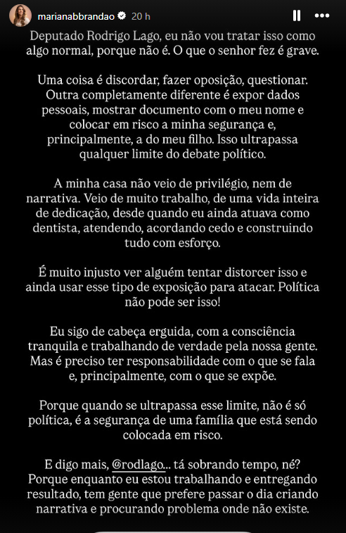 Em resposta, Mariana classificou o episódio como grave e acusou o deputado de ultrapassar os limites do debate político. “Discordar é legítimo. Expor dados pessoais e colocar em risco minha segurança e a do meu filho não”, afirmou.”