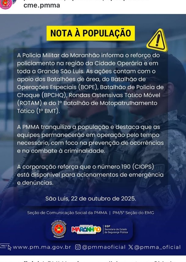 A Polícia Militar do Maranhão informou que o policiamento foi reforçado na região da Cidade Operária e em toda a Grande São Luís. As operações contam com o apoio dos Batalhões de Área, Batalhão de Operações Especiais (BOPE), Batalhão de Polícia de Choque (BPCHQ), Rondas Ostensivas Tático Móvel (ROTAM) e do 1º Batalhão de Motopatrulhamento Tático (1º BMT).